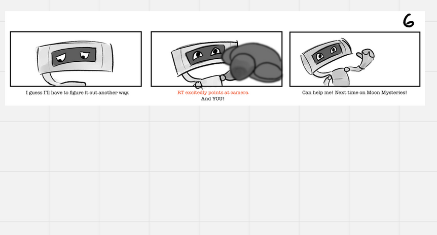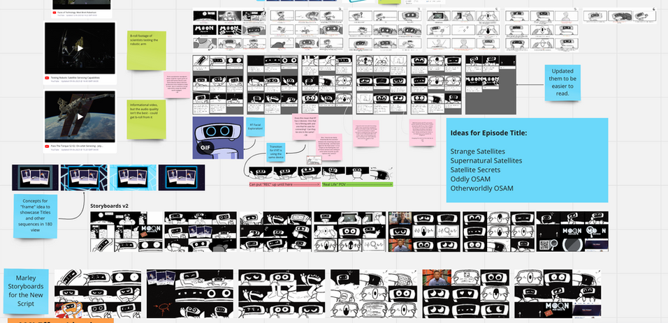 To begin the process of planning out the pilot episode of Moon Mysteries, my partner for this project, Marley, and I created a Miro Board to brainstorm ideas together. This allowed us to visualize the story and divide ideas into different sections, such as: storyboards, script, graphics designs, scheduling, title ideas, etc.